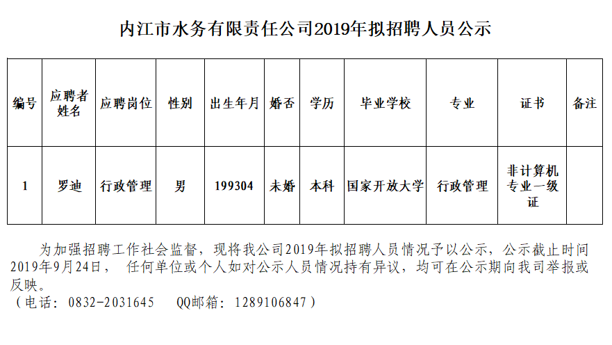 內江市水務有限責任公司2019年擬招聘人員公示