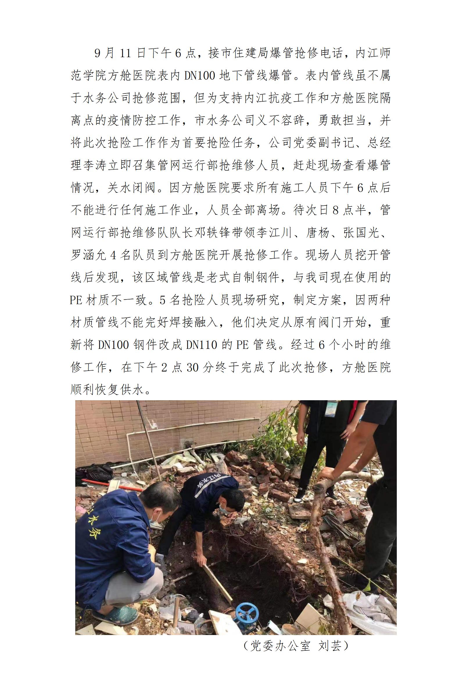 市水務(wù)公司支援內(nèi)江師范學(xué)院方艙 醫(yī)院搶修表內(nèi)管線